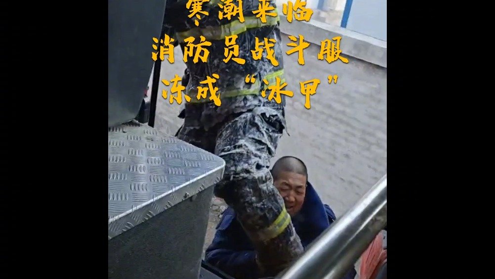 【严寒天气出警归来 #消防员战斗服冻成冰甲#】冷空气从28日开始发威,我国多地开启“速冻”模式。29日凌晨三点半,张家口地区室外温度降至零下20摄氏度以下,因执行灭火任务,张家口市消防救援支队怀来县大队消防员出警六小时后,战斗服被冻成“冰甲”,在战友帮助下才能爬上消防车。(记者 李继伟) 新华视点的微博视频