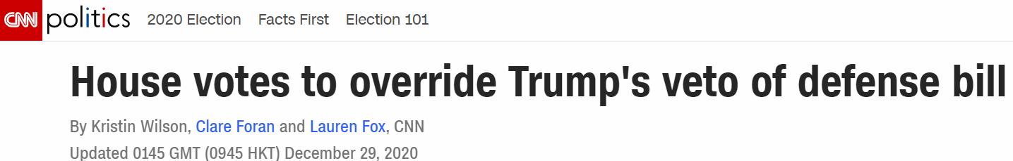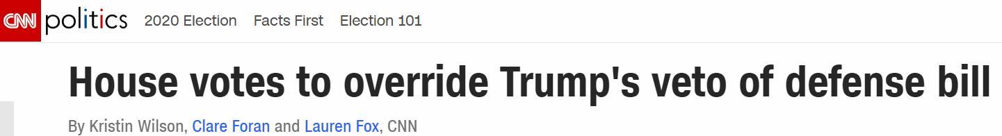 △28日,众议院投票推翻了此前特朗普对国防授权法案的否决决议。(图片来源:CNN)