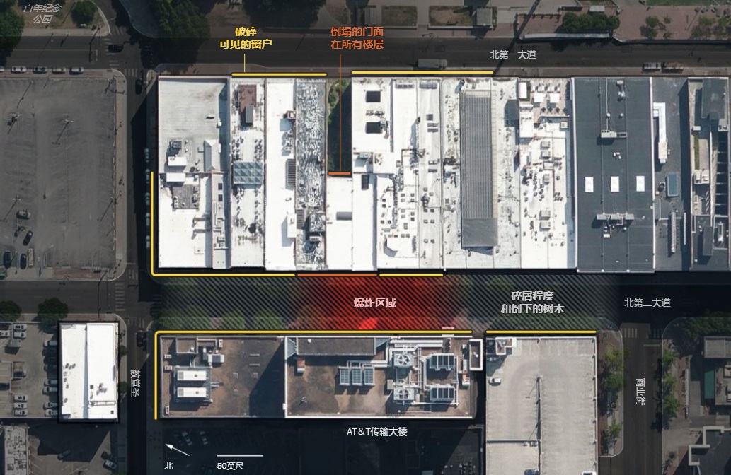 △《纽约时报》绘制的爆炸损害范围地图,爆炸的威力甚至波及到爆炸地大楼的另一侧。(图片来源:《纽约时报》)