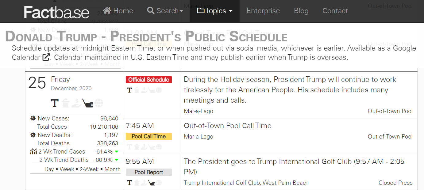 △据Factbase对美国总统特朗普个人的时间表记录,25日早9:57至下午2:05,特朗普都在特朗普国际高尔夫俱乐部。(资料来源:Factbase)
