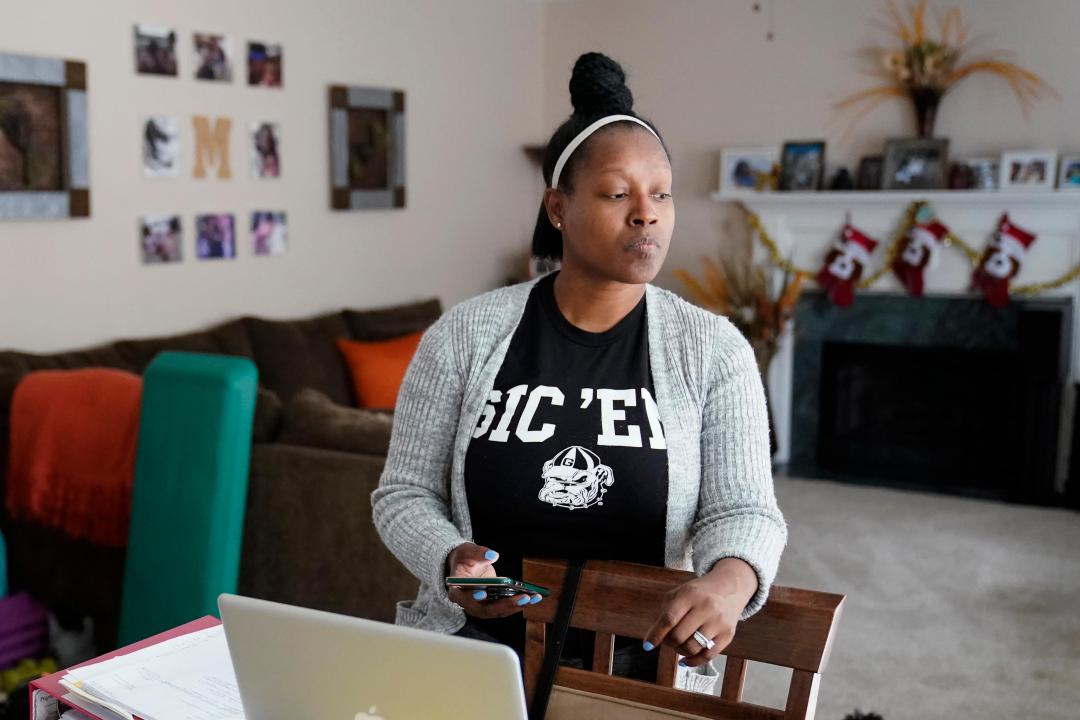 △夏尼塔·马修斯与她因疫情而不得不在家在线上学的女儿(图片来源:美联社)