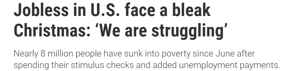 在南边与田纳西州接壤的佐治亚州,夏尼塔·马修斯(Shanita Matthews)却丝毫不期待25日这一天的到来。因为今年,她和他的丈夫买得起的东西只剩下了超市里的金枪鱼罐头和饼干。“我们确实没为节日做什么准备。”马修斯说,“我们在努力谋生,我真的很绝望。”这时的马修斯仍然在每天关注着新一轮纾困法案的进展,只是这份纾困计划在22日国会通过后,迟迟没有签署,和特朗普一道去了更南边的佛罗里达。