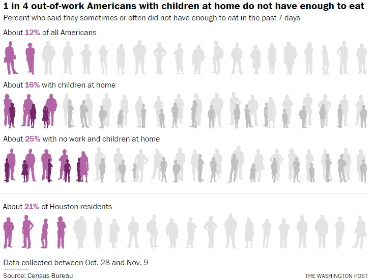 △据美国人口统计局统计,约1/4的有子女美国家庭出现失业,并且没有足够的食物;总计大约12%的美国人食物不足;16%的有子女美国家庭食物不足;休斯敦居民中食物不足的比例高达21%。(图片来源:《纽约时报》)