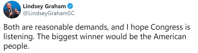 为了实现将个人纾困金标准上调至2000美元的目标,25日爆炸案发生后的四小时内,特朗普在高尔夫球场会见了共和党资深参议员林德赛·格林汉姆(Lindsey Graham)。而格林汉姆其实是共和党内部派来劝说特朗普签署纾困法案的说客。