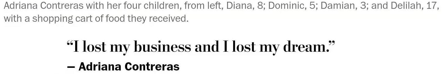 △阿德里亚娜·康特拉斯(Adriana Contreras)与她的四个孩子正推着购物车,车里装着他们领取到的救济食物。她说:“我失去了工作也失去了梦想。”(图片来源:《华盛顿邮报》)