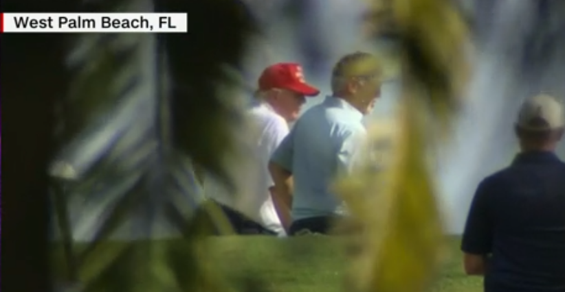 △据商业内幕(Business Incider)网站报道,特朗普在24日就前往他在佛罗里达的高尔夫球场。25日上午,CNN的记者拍摄下他在高尔夫球场打球的画面。(图片来源:CNN)