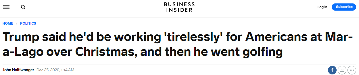 △商业内幕网25日报道称,特朗普说他将在假日期间“不知疲倦地”在马阿拉歌庄园为美国人工作,然后他就去打高尔夫了。(图片来源:商业内幕网)