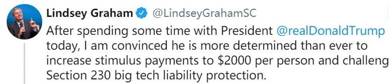 △25日晚,林德赛·格林汉姆在其个人社交账号上对特朗普要求提高纾困金额的决定表示赞许,但绝口不提因提高纾困金额而否决新一轮纾困草案可能造成的影响。(图片来源:社交媒体)