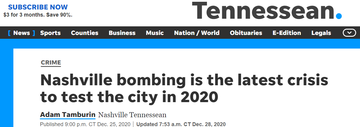 △《今日美国》田纳西地方版在12月25日发表报道《纳什维尔爆炸案是这个城市在2020年最后的考验》,报道中纪录了贝茜·威廉姆斯等人在爆炸发生前后的举措。(图片来源:《今日美国》)
