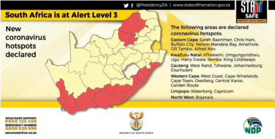 南非全国九个省中的六个省份的26个行政区(市)被设立为热点地区。热点地区严格管理(如热点地区居民和游客不能前往海滩,渔业捕捞暂停等)。