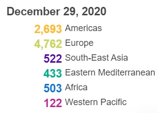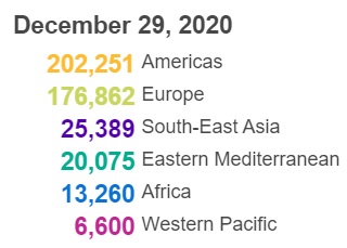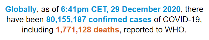 根据世卫组织最新实时统计数据,截至欧洲中部时间12月29日18时41分(北京时间12月30日1时41分),全球累计新冠肺炎确诊病例80155187例,累计死亡病例1771128例。29日全球新冠肺炎确诊病例新增444437例,死亡病例新增9035例。