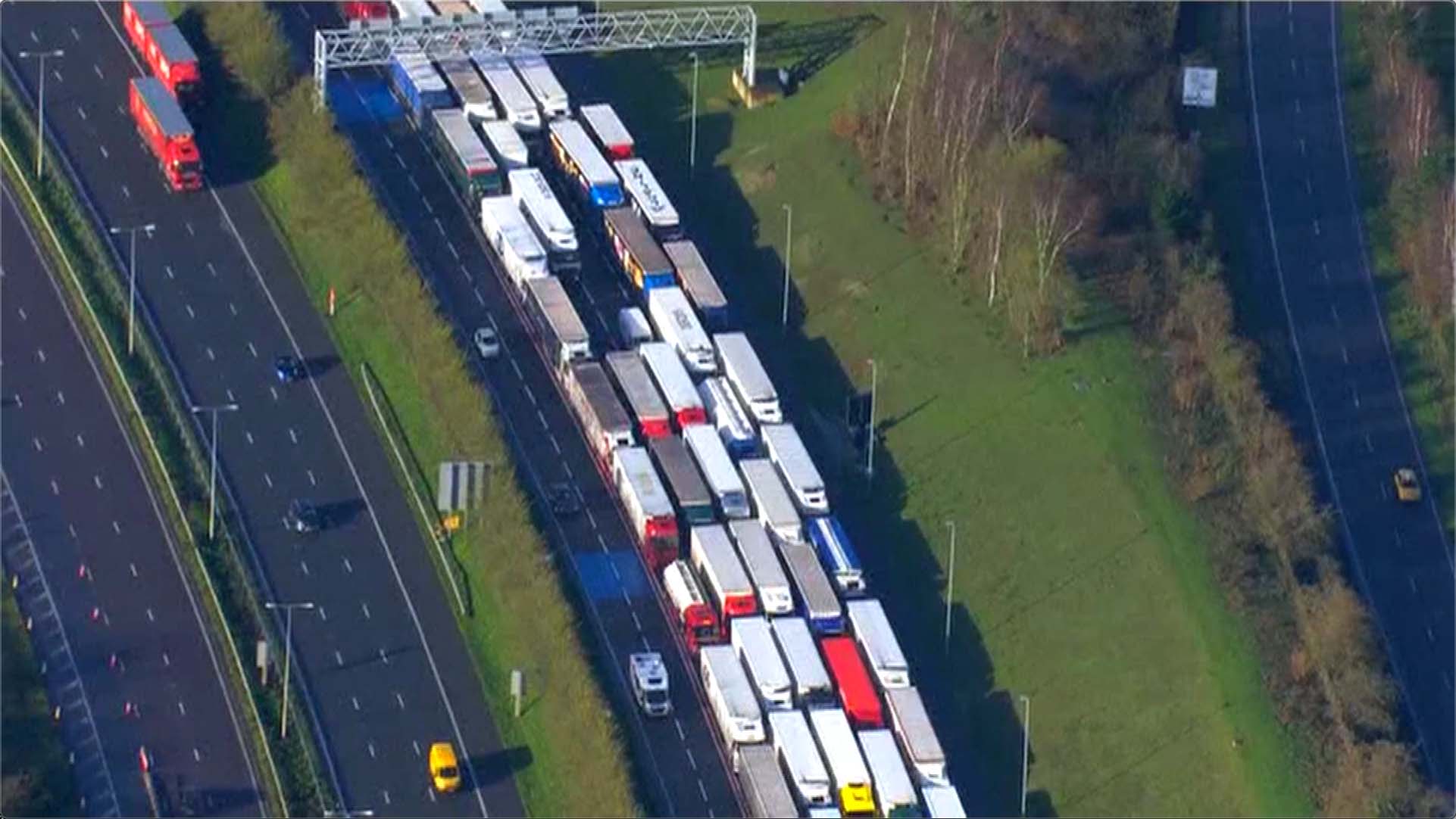 其实现在我们眼前的这番车水马龙的景象在平常并不多见,因为平时每天只有六七千辆货车从这儿经过,而英国首相鲍里斯·约翰逊12月10日在接受媒体采访时说,由于英欧贸易谈判极有可能是“无协议脱欧”的结果,所以他就呼吁广大英国民众和商家要开始为“无协议脱欧”做好准备。从那天开始,多佛港的货车数量就大幅增加,现在每天大概至少有1.2万辆货车从这里经过。