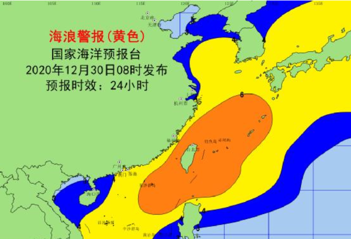 海浪黄色警报。受强冷空气的影响,预计:12月30日中午到31日中午,黄海北部将出现3到4米的大浪到巨浪区,黄海南部将出现4到5.5米的巨浪区,东海、钓鱼岛附近海域、台湾海峡将出现5到7米的巨浪到狂浪区,南海将出现4到6米的巨浪到狂浪区,近海海浪预警级别为黄色;辽宁东部、山东、江苏北部近岸海域将出现2到3米的中浪到大浪,该近岸海域海浪预警级别为蓝色;江苏南部、上海、浙江、福建近岸海域将出现3到4米的大浪到巨浪,该近岸海域海浪预警级别为黄色;海南东部近岸海域将出现2到3米的中浪到大浪,该近岸海域海浪预警级别为蓝色。