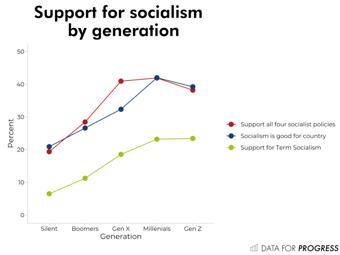 美国民调公司Data for Progress今年6月所做的一项调查显示,尽管“社会主义”在美国的政治语言体系中属于“负面”词汇,仍有35%的受访者认为“某种形式的社会主义对整个国家来说是好事”,而且,年轻的“千禧一代”和“Z时代”对“社会主义”的支持远高于年龄更大的美国人。