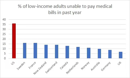△在美国,难以支付医疗费用的现象很普遍,36%的美国低收入成年人有这个问题,比其他国家高得多。