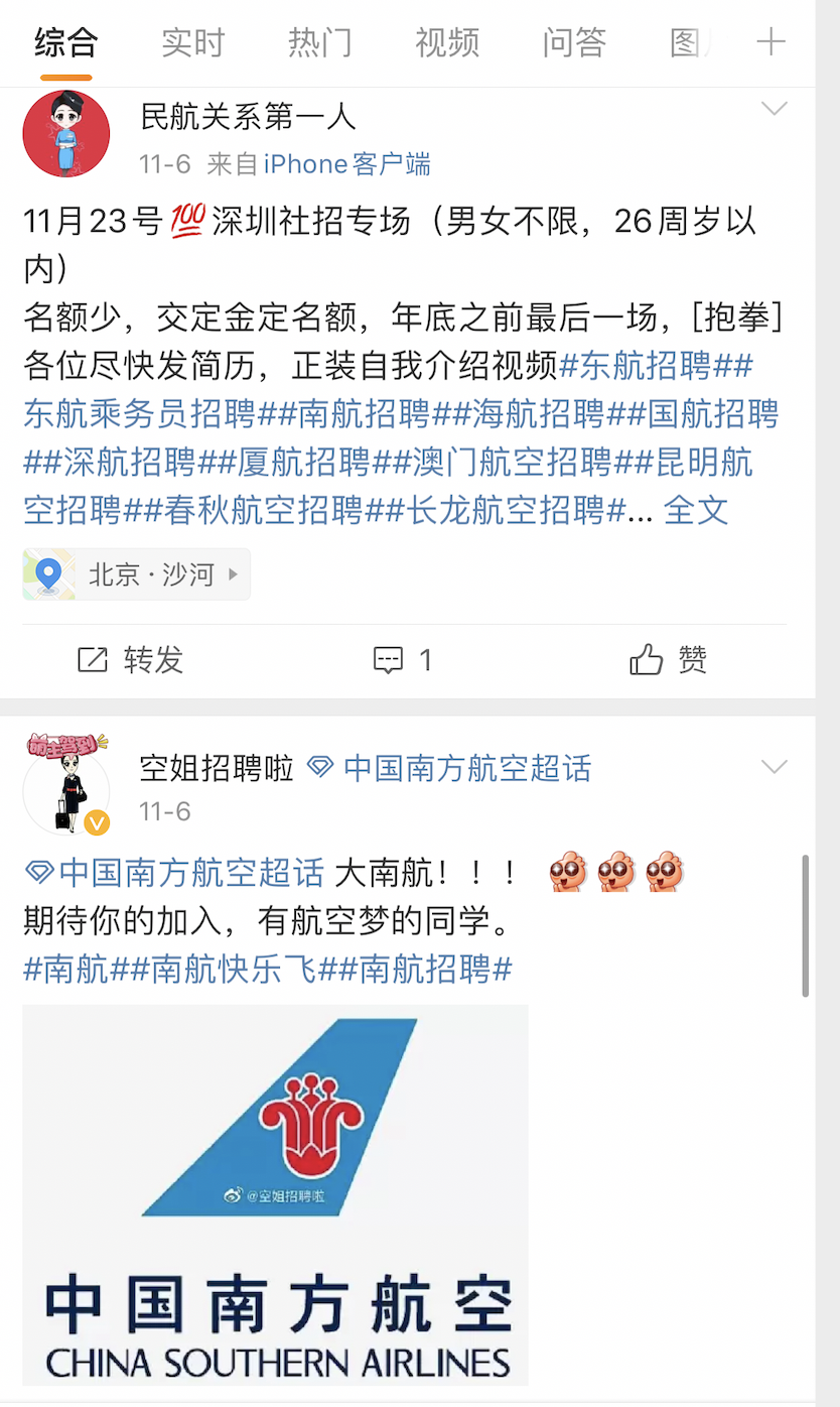 记者通过小贾提供的方式,在微博上检索“国航招聘”“空乘招聘” 等关键词发现,此类热点话题阅读量达到上千万且热度不断攀升。在这些话题中,一些中介通过付费购买的“保过宣传”信息还被微博管理员设置为“头条”放在讨论区前排位置,而普通的空乘面试经验讨论却寥寥无几。