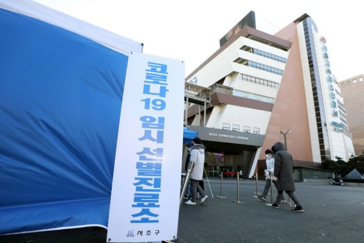 12月14日,工作人员在韩国首尔瑞草区的高速客运站门口搭建临时筛查所。新华社/纽西斯通讯社