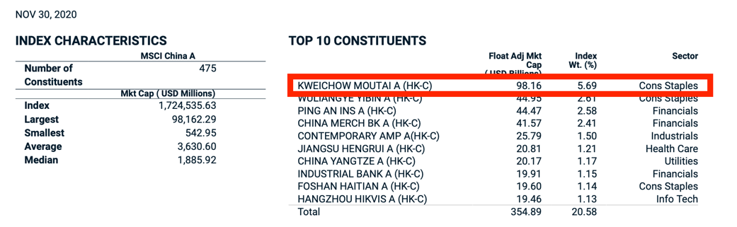 截至11月末,MSCI中国A股指数的第一大成分股便是贵州茅台,占指数权重的5.69%。