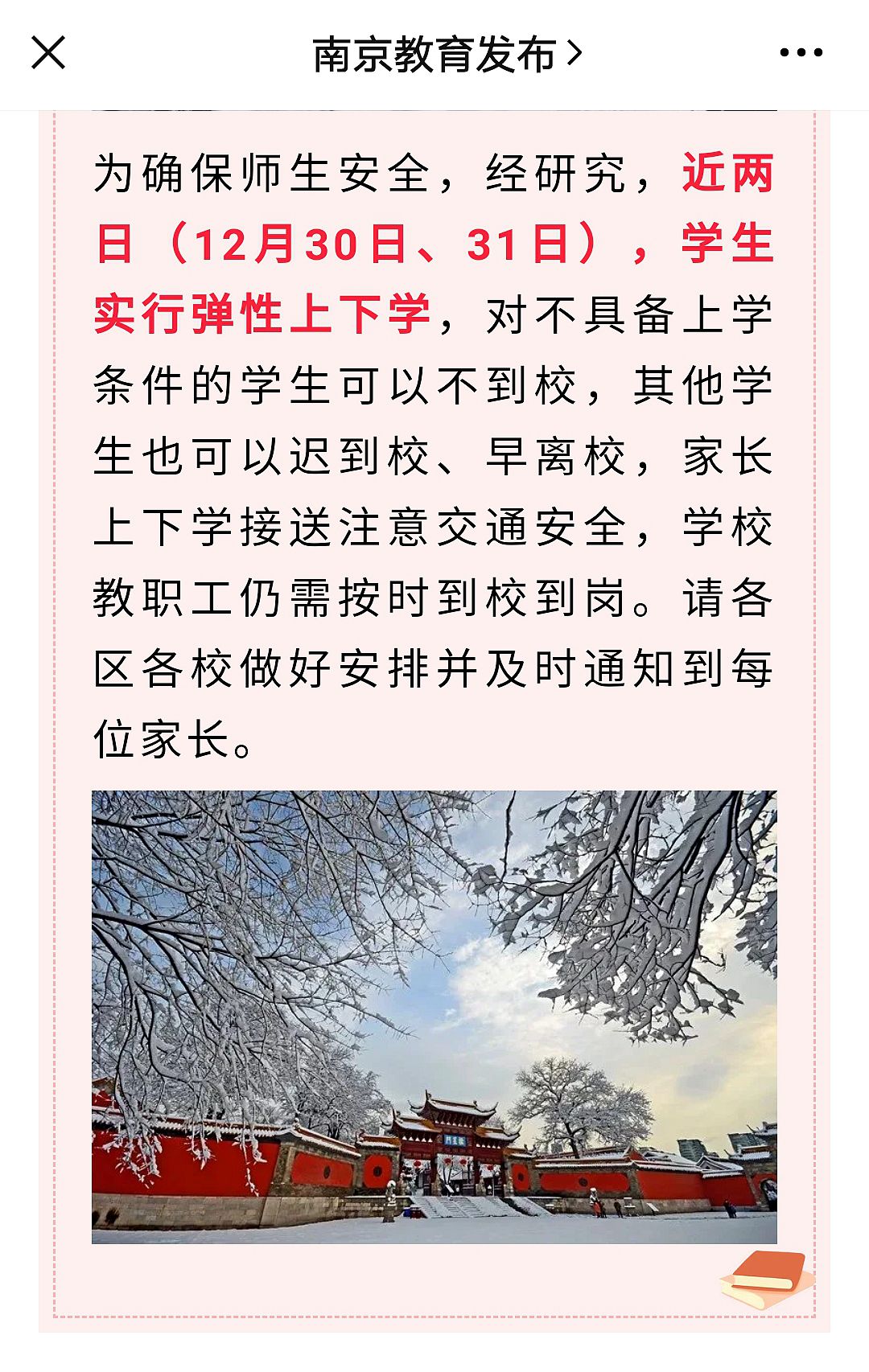 据南京市教育部发布的通告:因为大雪及道路结冰,为确保师生安全,12月30日、31日实行学生弹性上下学,对不具备上学条件的学生可以不到校,其他学生也可以迟到校、早离校。