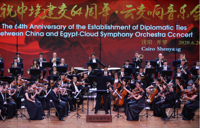 音乐会上,中国音乐家身着黑色礼服,在位于沈阳的辽宁歌剧院舞台上演出。万里之外的埃及正处于疫情严重期,开罗歌剧院的音乐家们被迫各自在家中演奏。