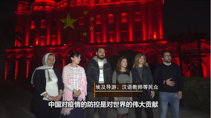 2020年3月1日晚,埃及导游莎莎(左一)和同伴们一起站在开罗千年历史地标——萨拉丁城堡前,用汉语高喊“中国加油”。 视频截图