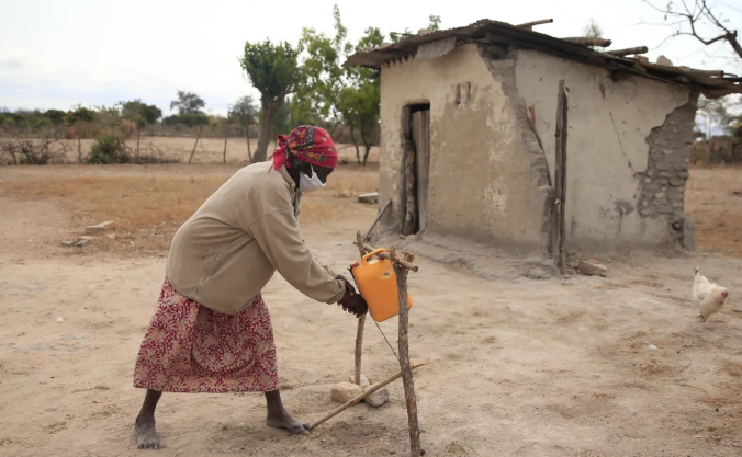 8月21日,在津巴布韦马尼卡兰省穆塔雷市的古塔乌拉雷村,村民用“脚踏式洗手器”洗手。新华社发(肖恩·朱萨摄)