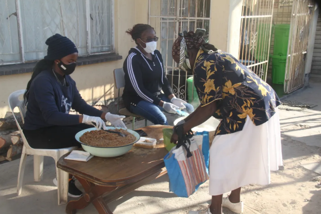 7月15日,在津巴布韦首都哈拉雷郊外一处住宅区,一位津巴布韦妇女在“社区厨房”领取食物。新华社发