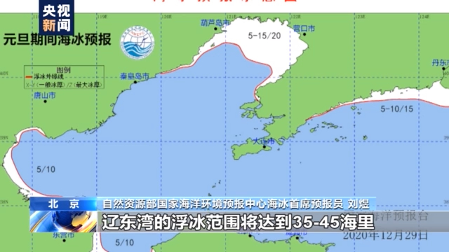 自然资源部国家海洋环境预报中心海冰首席预报员 刘煜:从我们最新拿到的海冰监测数据来看,最近辽东湾的海冰范围只有12海里左右,跟常年相比是偏轻的状况。但是随着强冷空气的到来,这种情况会发生变化,未来几天海冰将进入快速增长期。我们预计在元旦期间,辽东湾的浮冰范围将达到35—45海里,一般冰厚5-15厘米,最大20厘米。
