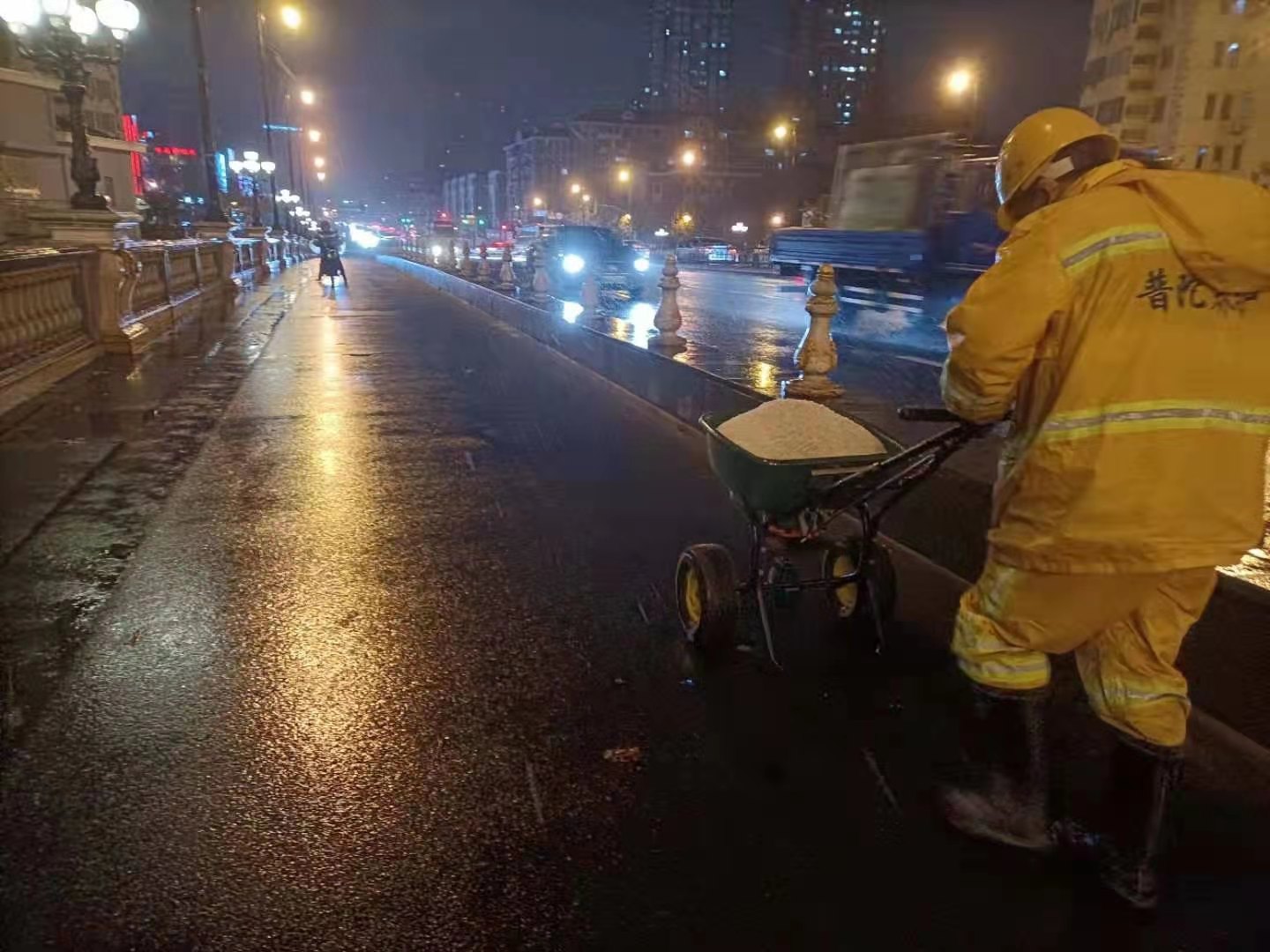 ↑收到预警后,工作人员在武宁路桥人行道、爬梯处撒盐。(受访者供图)