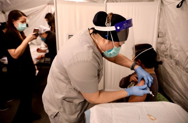 12月18日,在美国加州蒙特雷帕克,医护人员在临时搭建的帐篷里接受辉瑞公司的新冠疫苗注射。新华社发