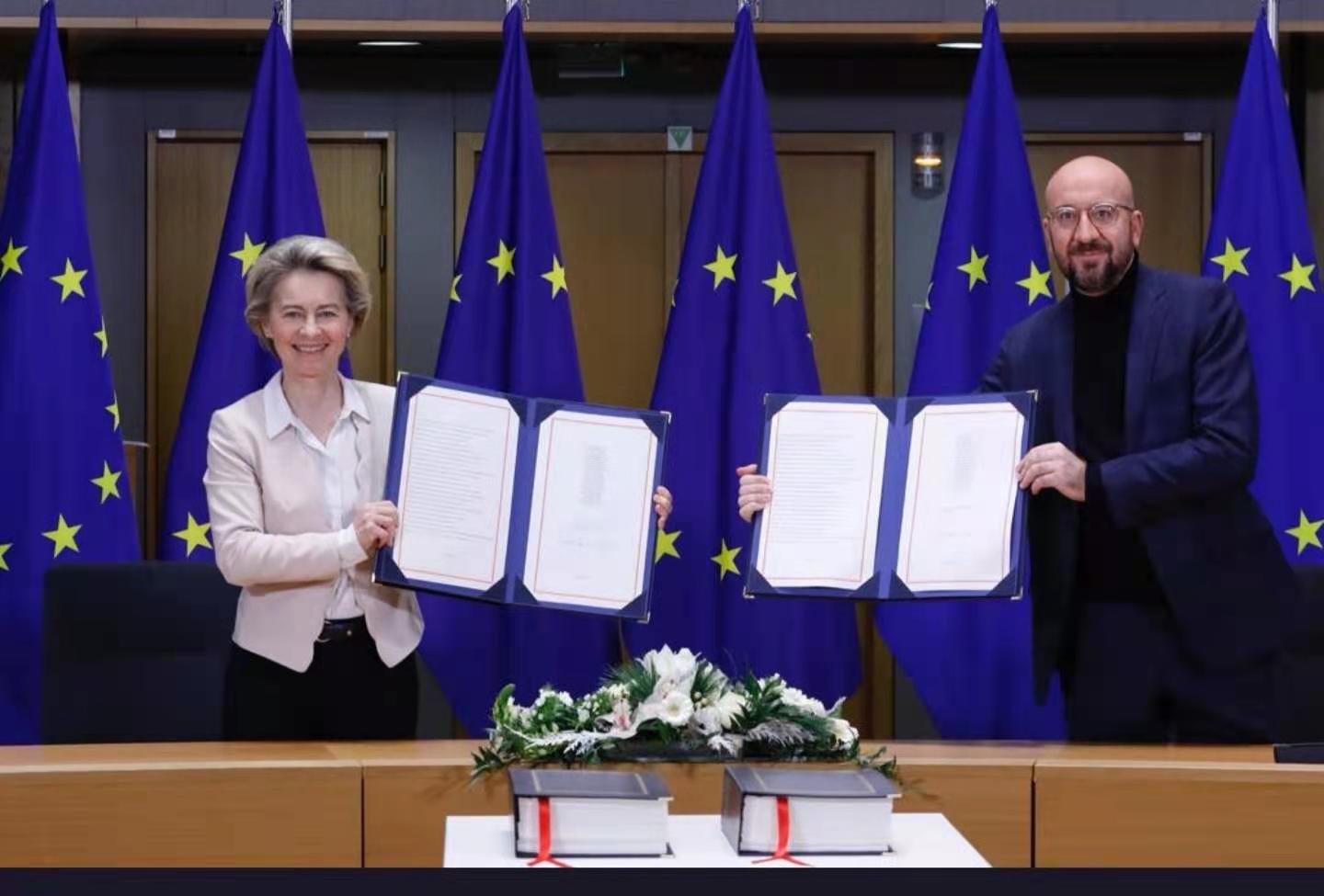 欧洲理事会主席米歇尔、欧盟委员会主席冯德莱恩于当地时间30日上午9点半在布鲁塞尔签署了《英欧贸易和合作协议》。