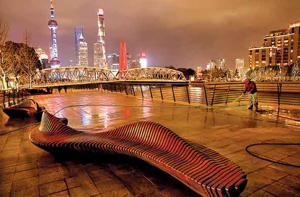 ▲12月28日,工人在苏州河外白渡桥附近清洗人行步道。近日,上海苏州河贯通工程进入收尾阶段。截至目前,除个别区段和点位外,苏州河两岸42公里滨水岸线已基本实现贯通开放。新华社记者陈飞摄