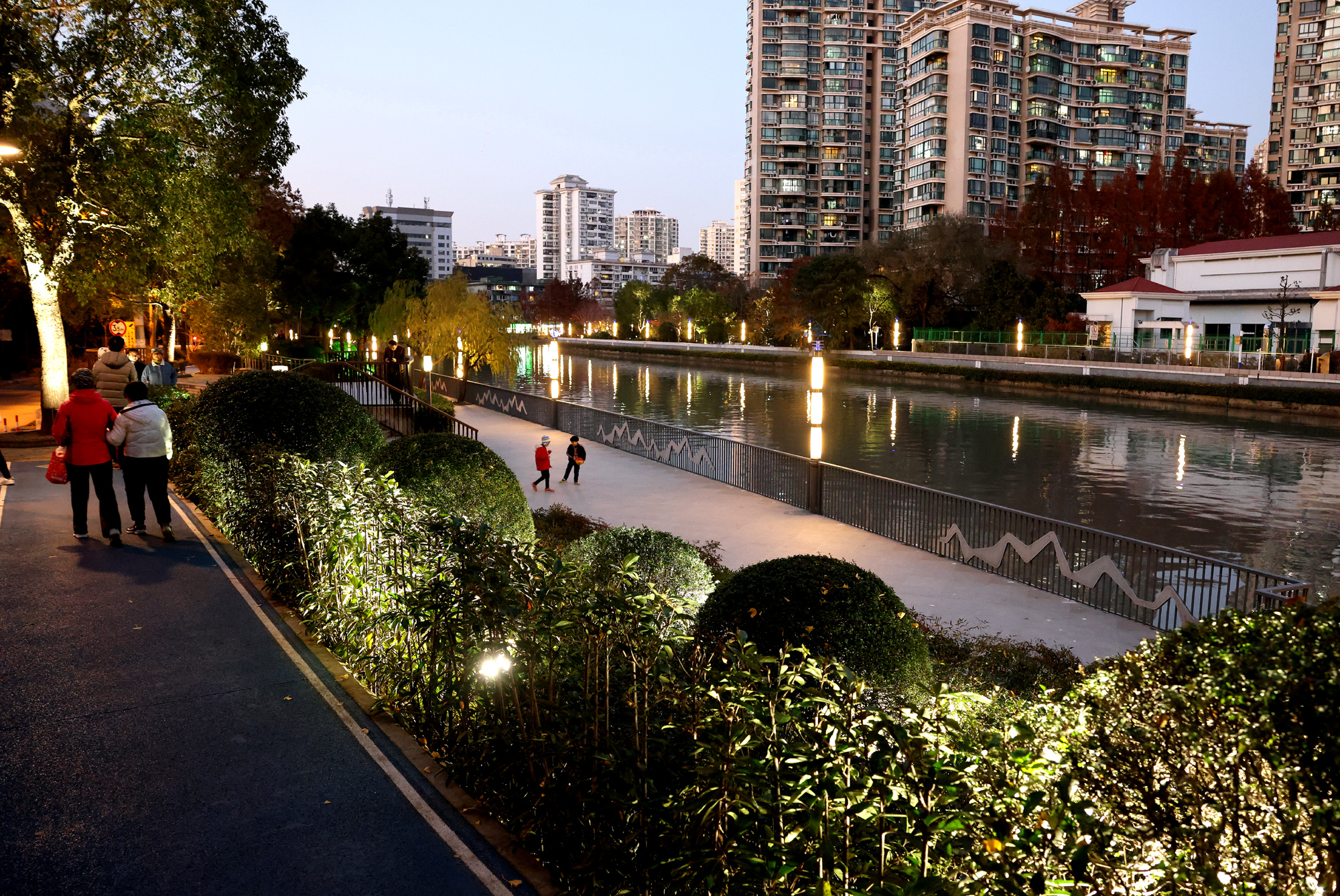 住在上海总商会附近的朱女士接女儿放学后来到公共绿地休闲。朱女士告诉记者:“几年前,这里附近的建筑比较破旧,绿化品种单一,休闲空间小。苏州河静安区段滨河岸线的打造让这里的绿化品种丰富了,居民休闲去处也多了,无论白天还是晚上都有人来这里打卡,我和女儿都很喜欢这里。”