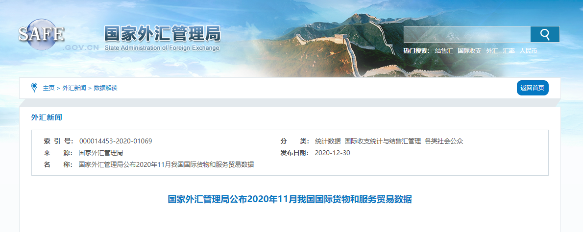 今天(12月30日),国家外汇管理局公布2020年11月我国国际货物和服务贸易数据。11月,我国国际收支口径的国际货物和服务贸易收入18380亿元,支出14535亿元,顺差3845亿元。其中,货物贸易收入17082亿元,支出12520亿元,顺差4562亿元;服务贸易收入1298亿元,支出2015亿元,逆差717亿元。(总台央视记者 董彬)