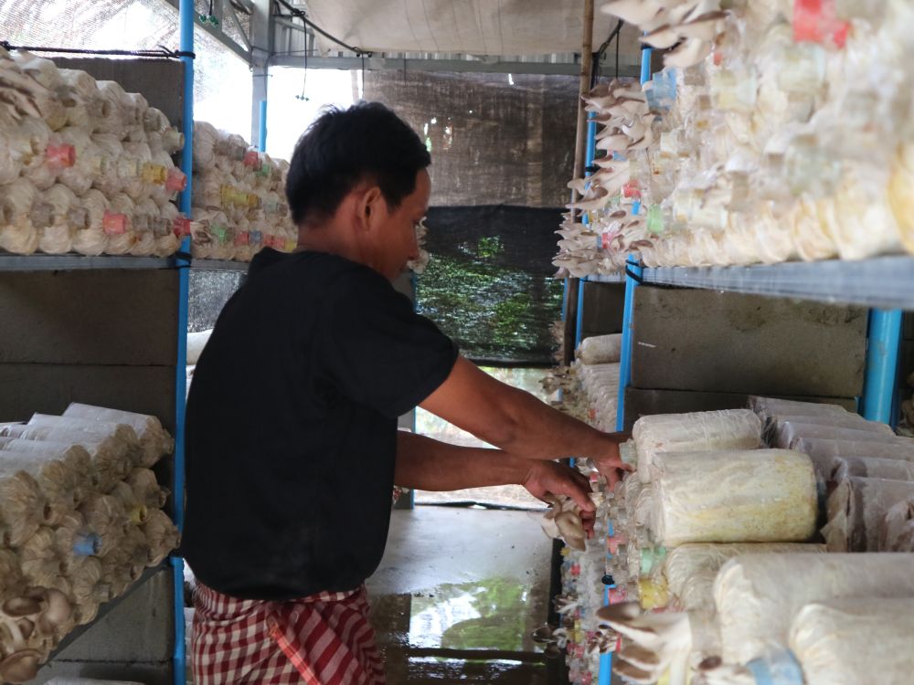 图为2020年4月13日,农户祝金在柬埔寨干丹省莫穆坎普县斯瓦安普乡的蘑菇棚内劳作。(新华社发)