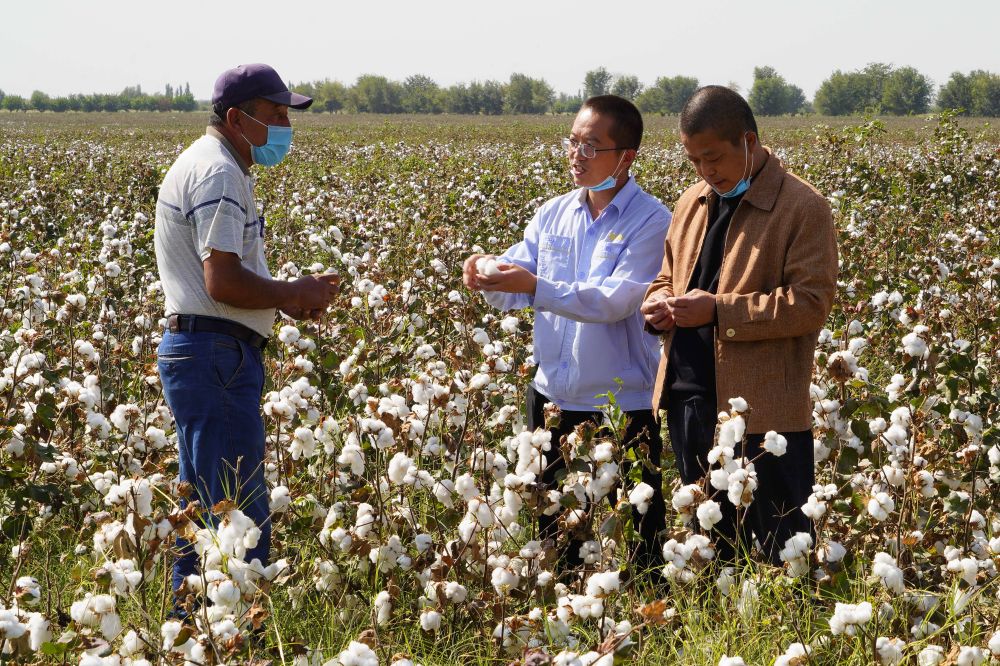 图为2020年9月24日,在乌兹别克斯坦锡尔河州,中国技术专家与棉农交流滴灌种植经验。(新华社发 扎法尔摄)