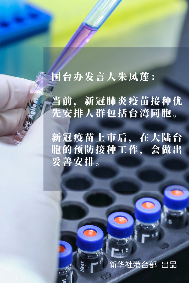 新华社北京12月30日电(记者刘欢、查文晔)国台办发言人朱凤莲30日在例行新闻发布会上应询表示,新冠肺炎疫苗接种优先考虑进口冷链、物流、口岸、国际和国内交通运输等感染风险比较高的人群,包括台湾同胞。疫苗上市后,在大陆台胞的预防接种工作会做出妥善安排。