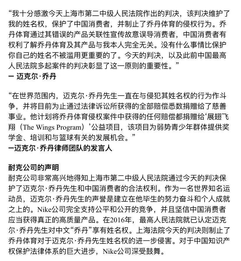 30日,迈克尔·乔丹发表声明表示,该判决维护了自己的姓名权,并制止了乔丹体育的侵权行为:“中国消费者有权了解乔丹体育及其产品与我本人完全无关。没有什么事情比保护你自己的姓名不被滥用更重要的了。”据迈克尔·乔丹团队介绍,案件的侵权的任何赔偿都将将捐赠给“展翅飞翔”公益项目。