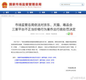 【市场监管总局依法对京东、天猫、唯品会三家平台不正当价格行为案作出行政处罚决定】针对“双十一”前后消费者反映强烈的网购先提价后打折、虚假促销、诱导交易等问题,根据价格监测和投诉举报等有关线索,市场监管总局依法对北京京东世纪信息技术有限公司(京东)、杭州昊超电子商务有限公司(天猫)、广州唯品会电子商务有限公司(唯品会)三家企业开展自营业务不正当价格行为进行了调查,并于2020年12月24日依据《价格法》第四十条、《价格违法行为行政处罚规定》第七条作出处罚决定,对上述三家企业分别处以50万元人民币罚款的行政处罚。