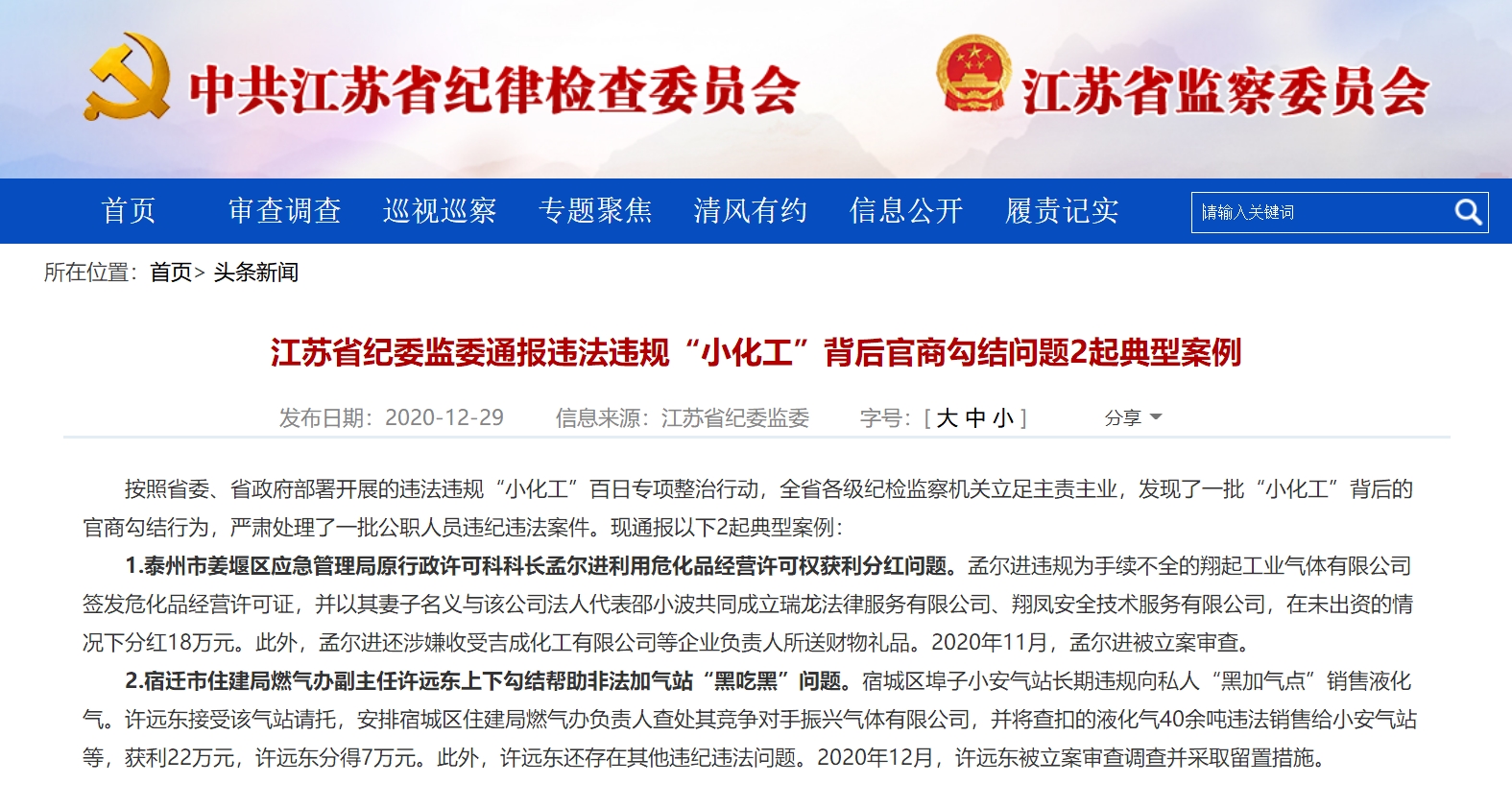 近日,江苏省委、省政府部署开展的违法违规“小化工”百日专项整治行动中,发现了一批“小化工”背后的官商勾结行为,严肃处理了一批公职人员违纪违法案件。现通报以下2起典型案例:
