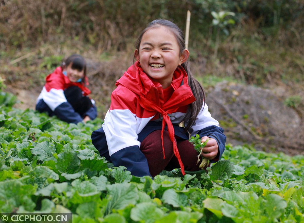 ↑2020年12月29日,贵州省毕节市黔西县花溪彝族苗族乡沙坝小学,学生在菜园里体验劳作。CICPHOTO/周训超 摄