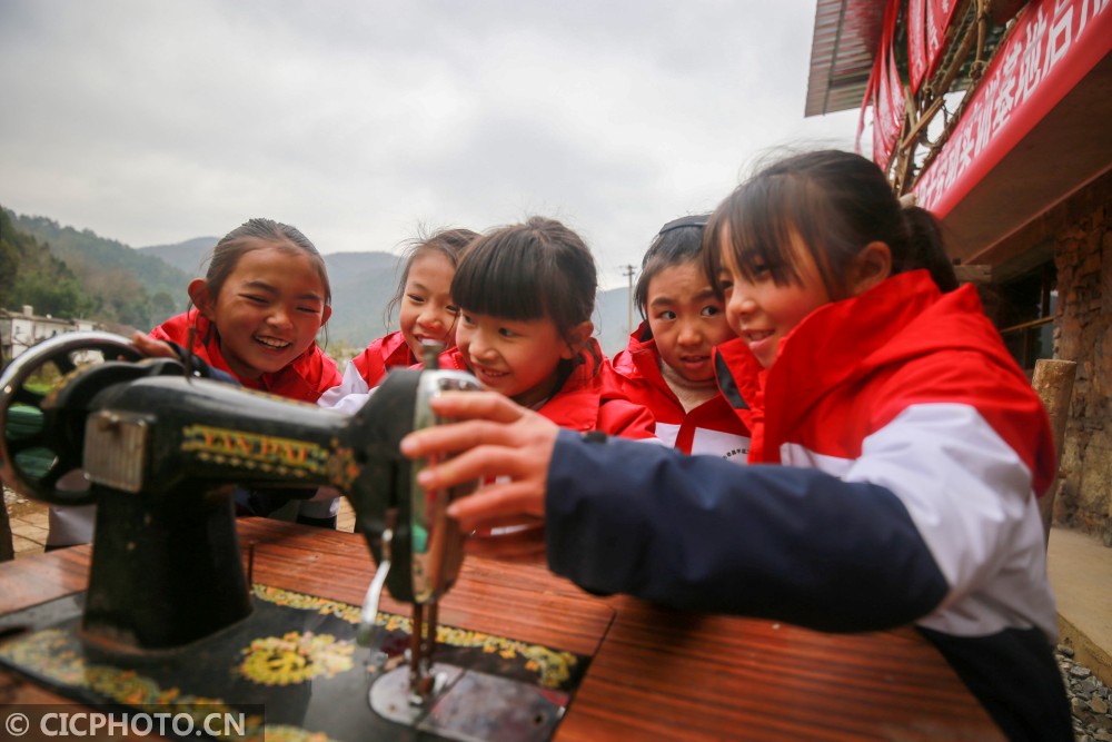 ↑2020年12月29日,贵州省毕节市黔西县花溪彝族苗族乡沙坝小学,学生在体验老式缝纫。CICPHOTO/周训超 摄