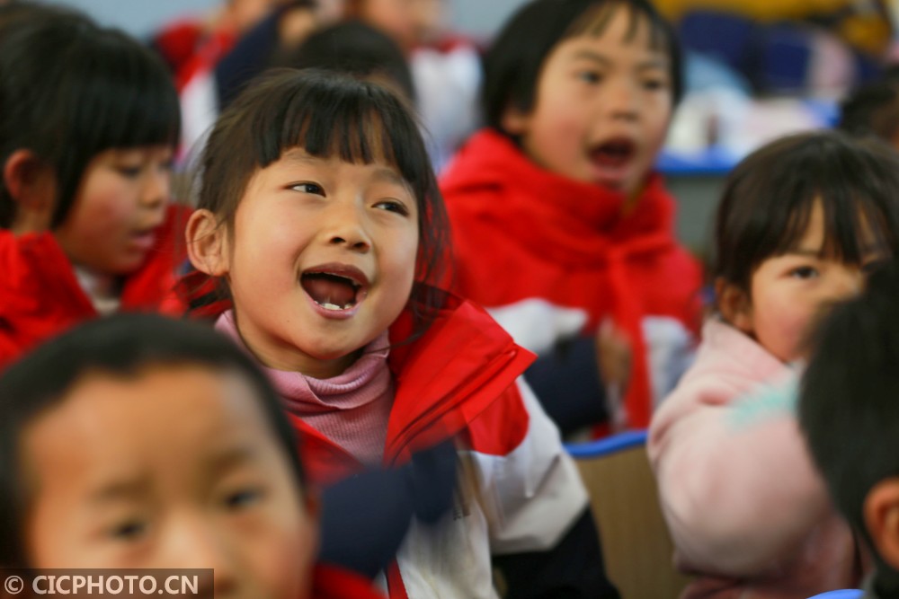 ↑2020年12月29日,贵州省毕节市黔西县花溪彝族苗族乡沙坝小学,学生在上音乐课。CICPHOTO/周训超 摄