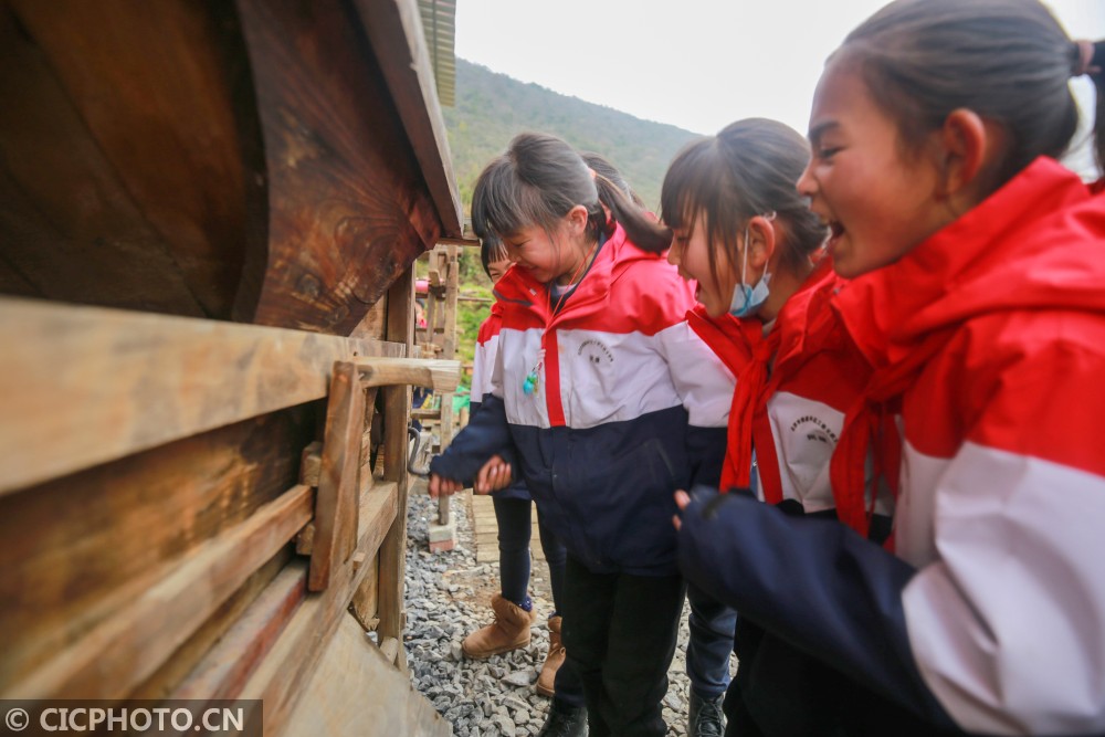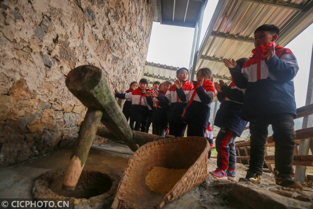↑2020年12月29日,贵州省毕节市黔西县花溪彝族苗族乡沙坝小学,学生在体验推磨。CICPHOTO/周训超 摄