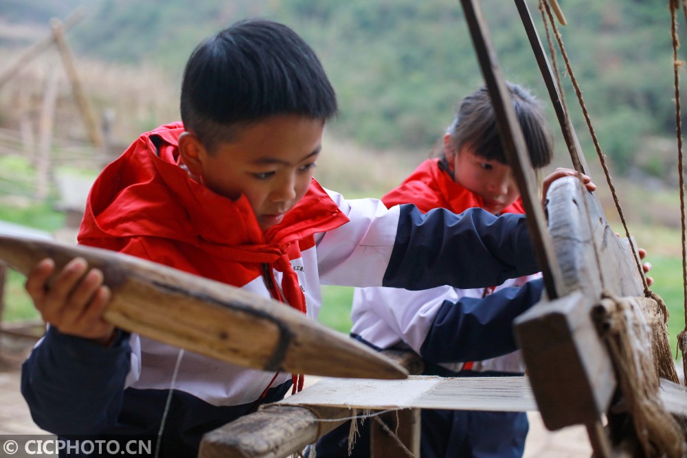 ↑2020年12月29日,贵州省毕节市黔西县花溪彝族苗族乡沙坝小学,学生在体验织土布。CICPHOTO/周训超 摄