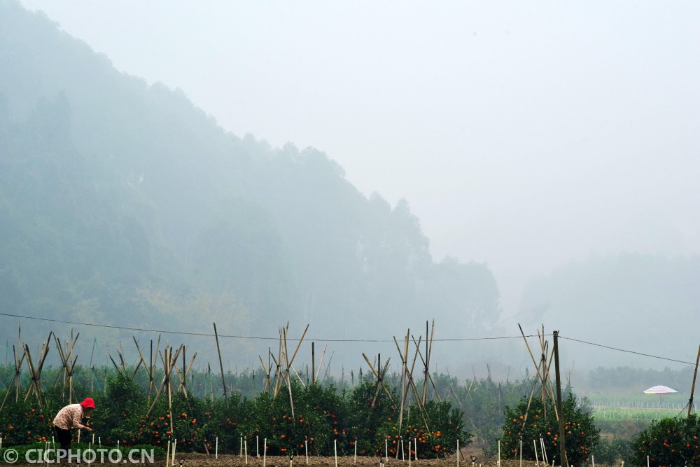 2020年12月27日,广西壮族自治区南宁市烟雨朦胧,武鸣区农民抓紧农时在田间栽种冬季瓜菜。