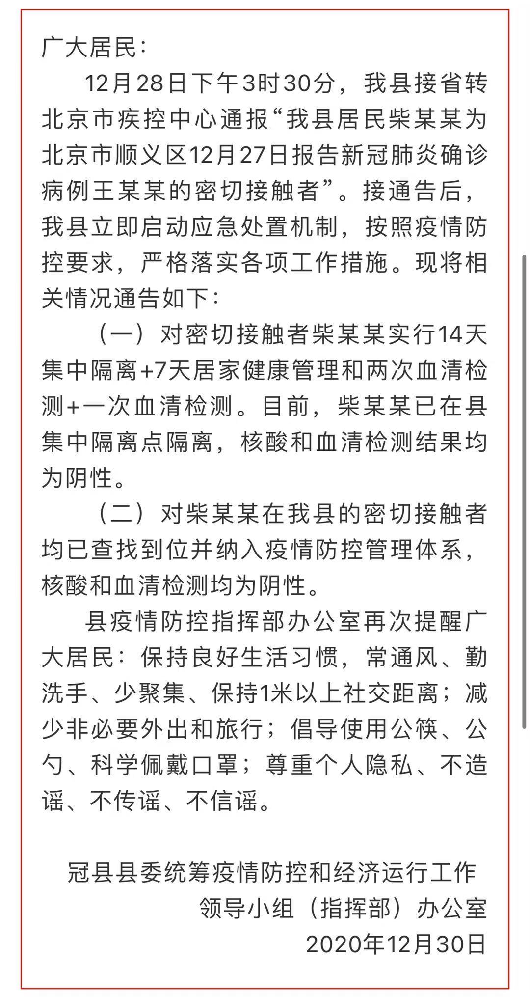 记者今天(12月30日)从山东冠县县委统筹疫情防控和经济运行工作领导小组(指挥部)办公室了解到,12月28日下午3时30分,山东冠县接省转北京市疾控中心通报“冠县居民柴某某为北京市顺义区12月27日报告新冠肺炎确诊病例王某某的密切接触者”。接通告后,冠县立即启动应急处置机制,按照疫情防控要求,严格落实各项工作措施。现将相关情况通告如下: