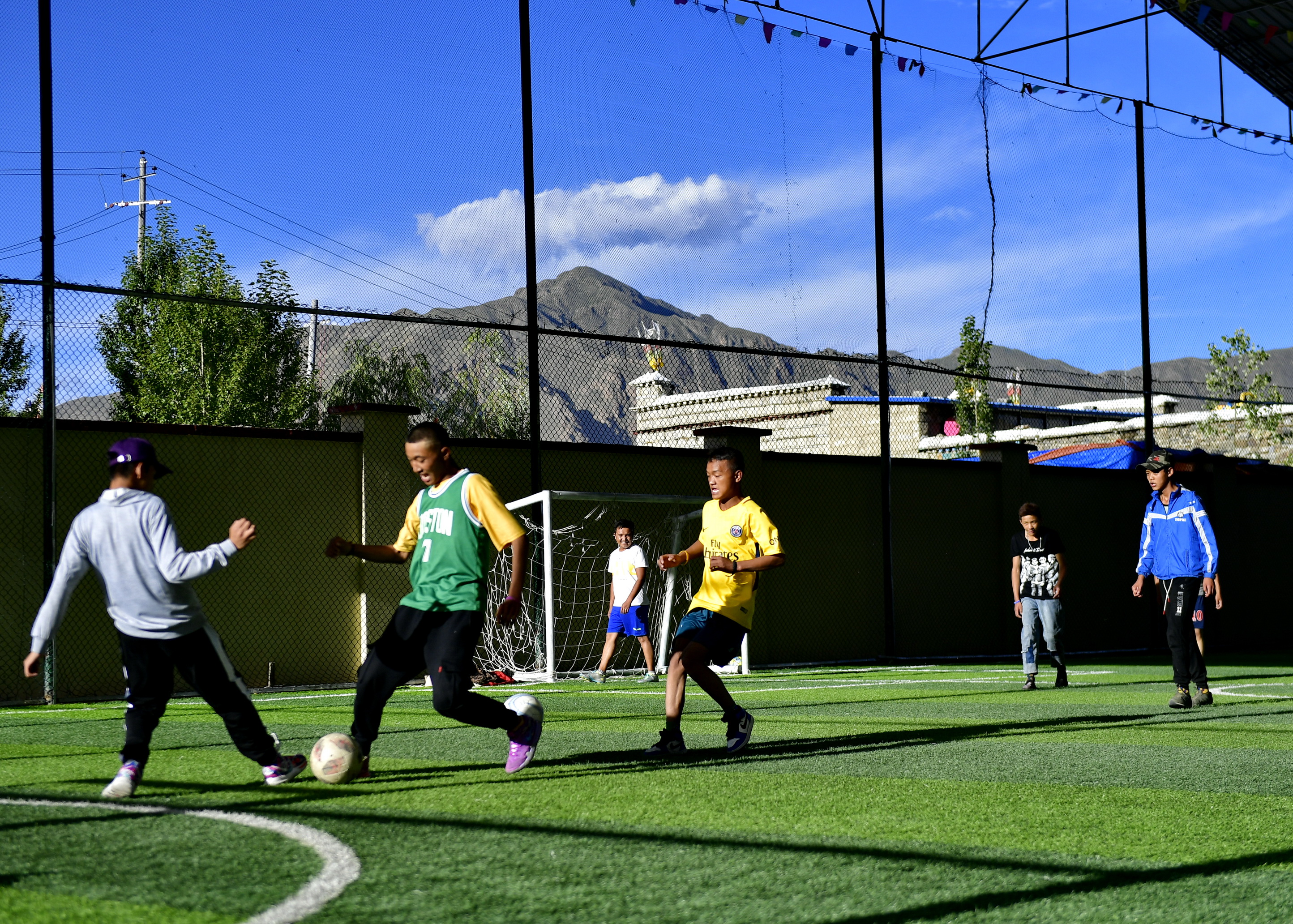 孩子们在西藏山南市泽当镇赞堂社区操场踢足球。新华社记者 张汝锋 摄