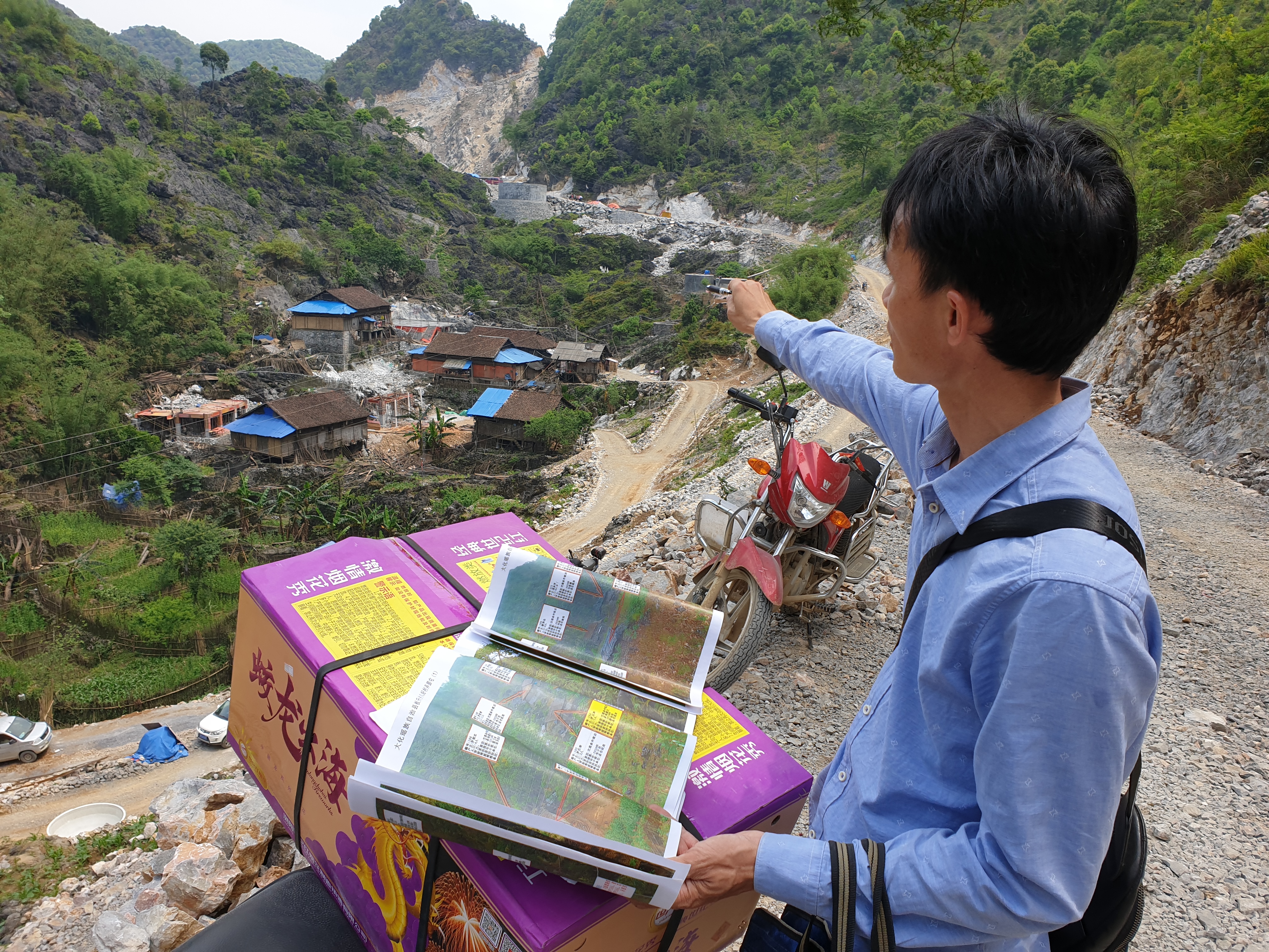 图为大化瑶族自治县板升乡八好村驻村第一书记韦德王拿着自制的扶贫地图向记者介绍项目推进情况。