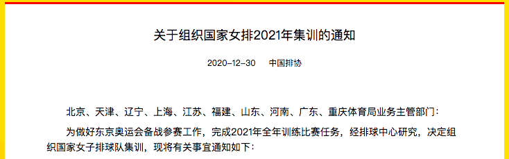新华社北京12月30日电(记者卢星吉)中国排球协会30日在官网上公布了国家女排2021年集训运动员名单,与2020年的名单相比,新公布的名单总体变化不大,但在接应、副攻和二传位置上仍有调整。